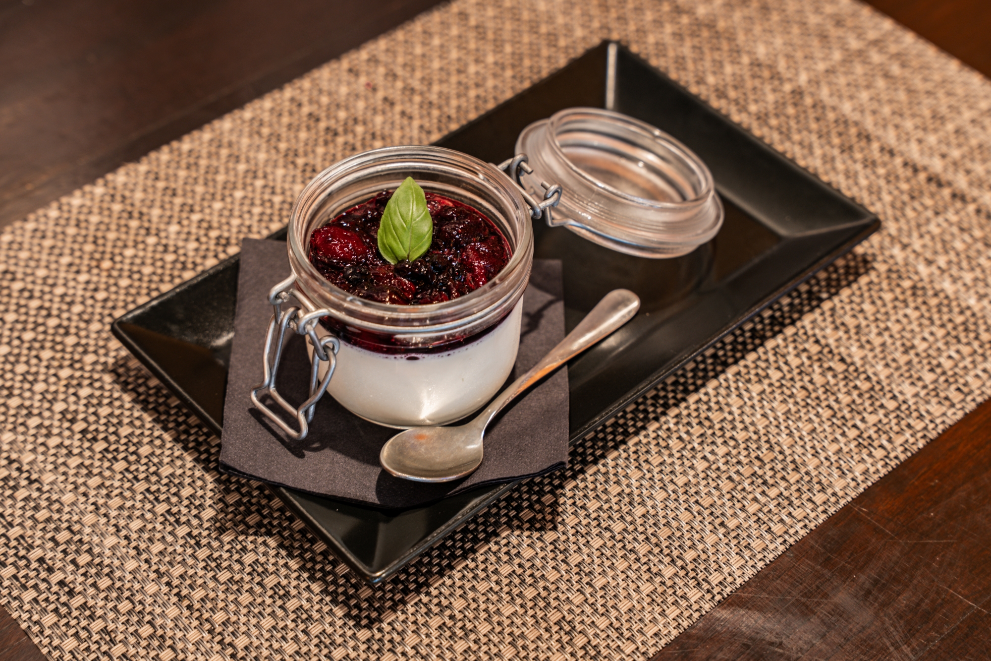 Pannacotta navdušuje s svojo svilnato, kremasto teksturo, ki se popolno dopolnjuje z bogatim čokoladnim prelivom in osvežilnimi gozdnimi sadeži. Sladica, ki združuje najboljše iz obeh svetov.